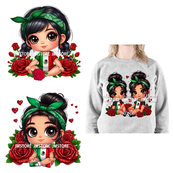 עיצובים של ילדה מקסיקנית חמודה צ'יבי ספרדית אדום ורד ירוק קשת קוקט קשת נסיכת לטינה ברזל על DTF העברות מדבקות לחולצות טריקו